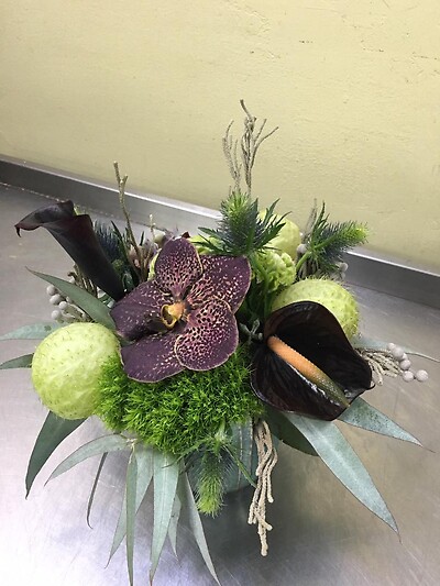 The creepy spiders invade the night as symbolized by arrangement of flowers in black, blue, and gray shades including calla lilies, moonlight vanda orchid, green trick, coxcomb, anthurium, milk pods, brunia, thistles, and spiky eucalyptus. Substitution of seasonal flowers may be necessary if not available to make similar feel and look.